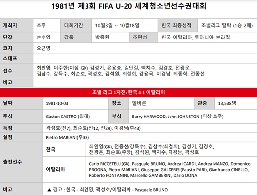 우선, 1981년 호주에서 열린 U20 월드컵 조별리그 1차전에서의 경기를 떠올려보죠. 예상을 뒤엎고 한국은 이탈리아를 대승으로 이겼습니다. 경기 초반, 곽성호의 선제골이 나오며 한국은 먼저 앞서갔습니다. 그리고 전반 12분과 29분에는 최순호가 멀티골을 작렬시켜 더 큰 우승 기대감을 안겨주었습니다. 하지만 후반 38분에 이탈리아의 피에트로 마리아니에가 한 골을 넣어 추격을 시도했지만, 5분 뒤 이경남이 쐐기포를 쏘아올려 기분 좋은 승리로 마무리했습니다.