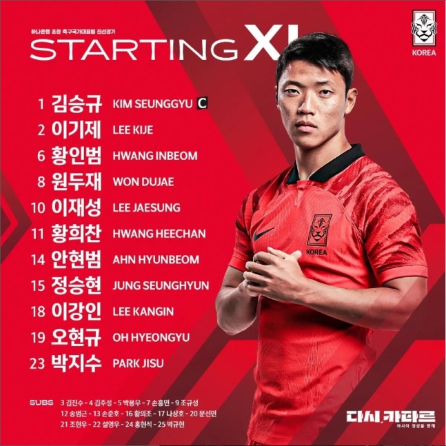 우선, 한국 대표팀은 이번 경기를 위해 다양한 선수들로 구성된 라인업을 발표했습니다. 이날 경기에서는 아쉽게도 '캡틴' 손흥민은 선발 출전하지 못하고 벤치에서 팀 동료들을 응원하게 됐습니다. 이는 손흥민이 리즈 유나이티드와의 프리미어리그 최종전 후 스포츠 탈장 수술을 받은 뒤의 상황 때문인데요.